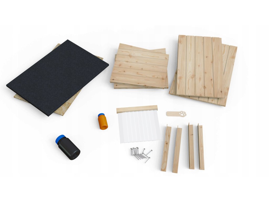Zateplená psí bouda je vyrobena z kvalitních a pevných materiálů, které zajišťují její dlouhou životnost a ochranu před vnějšími vlivy. Hlavní konstrukci tvoří 14mm obkladové desky, které poskytují stabilitu a pevnost. Interiér je izolován 2cm silným polystyrenem, který účinně udržuje teplo a chrání psa před chladem. Vnitřní stěny jsou obloženy 3mm HDF deskou.