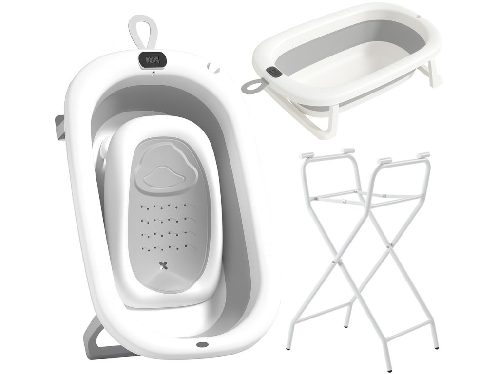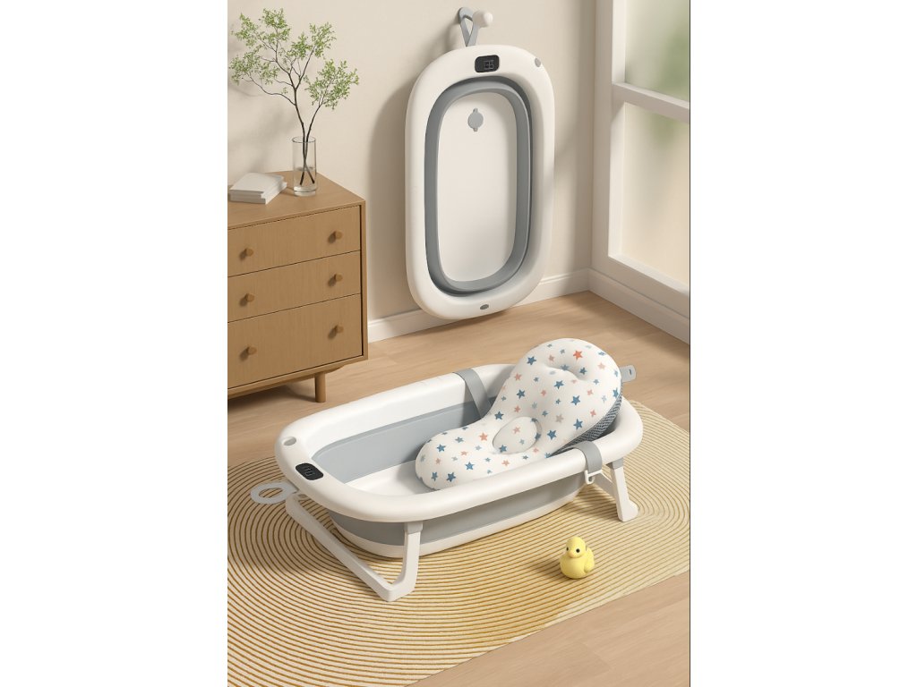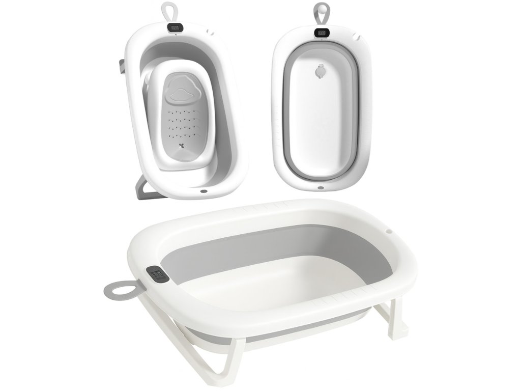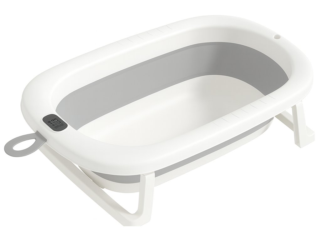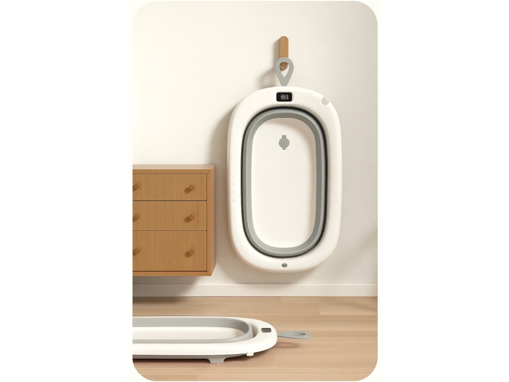 Elektronický teploměr s přesností na desetinu stupně Celsia pomáhá udržet ideální teplotu vody. Ergonomický tvar vaničky poskytuje přístup z každé strany a protiskluzové nožičky zaručují stabilitu. Po koupání ji jednoduše složíte na výšku deset centimetrů a můžete zavěsit na zeď pomocí silikonového háčku.