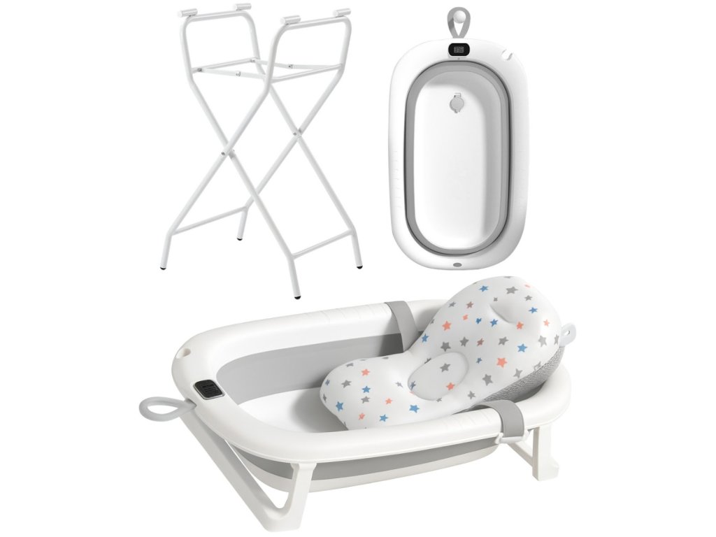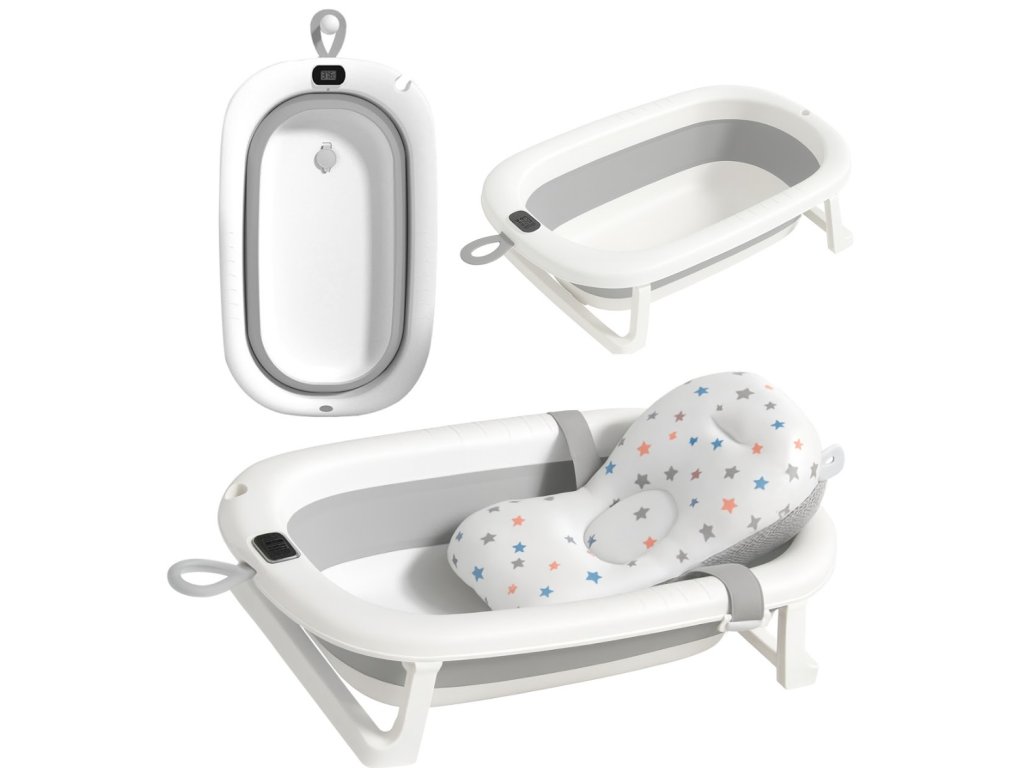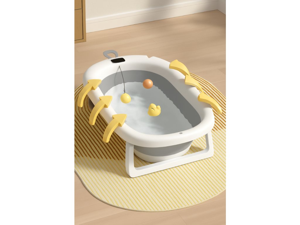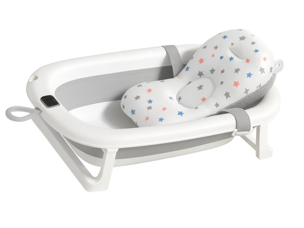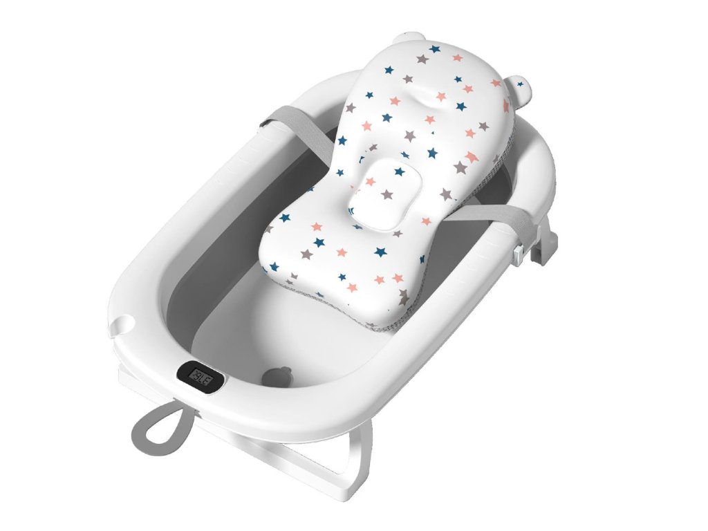 Elektronický teploměr s přesností na desetinu stupně Celsia pomáhá udržet ideální teplotu vody. Ergonomický tvar vaničky poskytuje přístup z každé strany a protiskluzové nožičky zaručují stabilitu. Po koupání ji jednoduše složíte na výšku deset centimetrů a můžete zavěsit na zeď pomocí silikonového háčku.