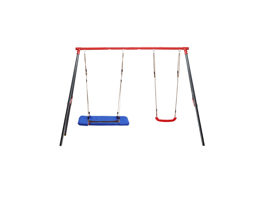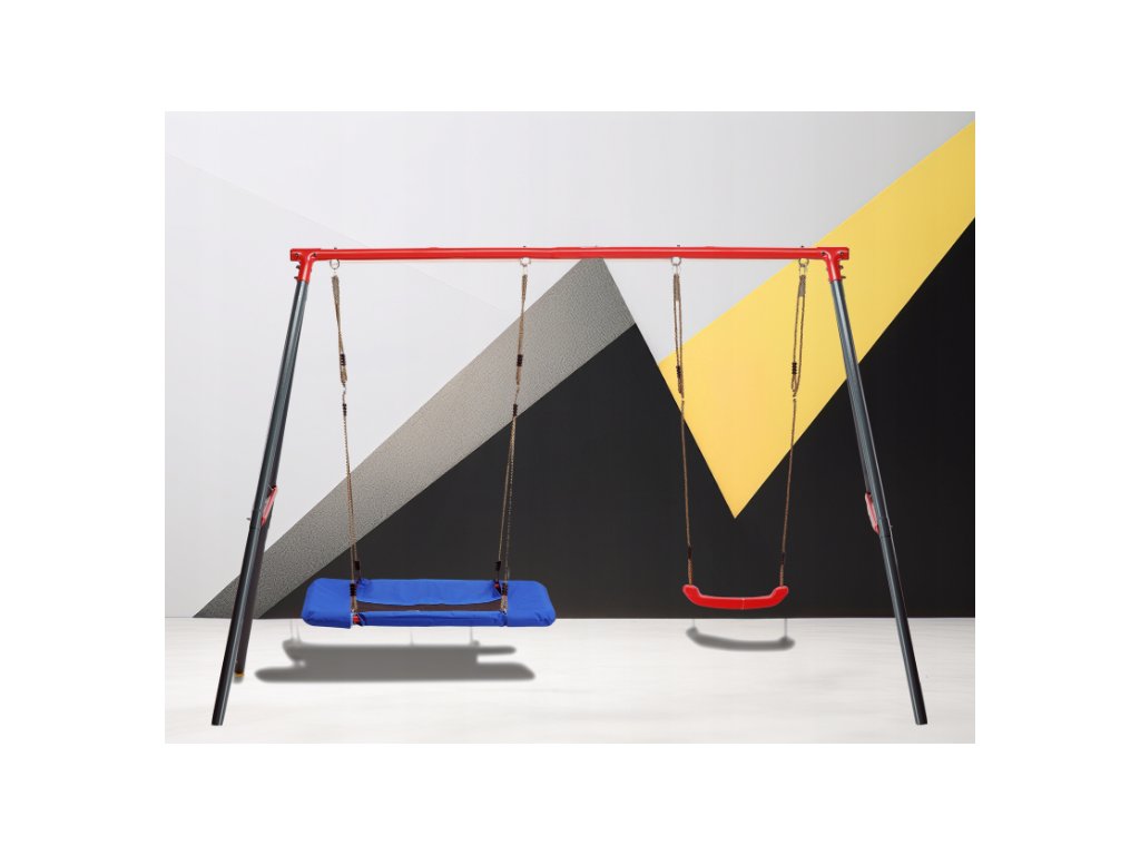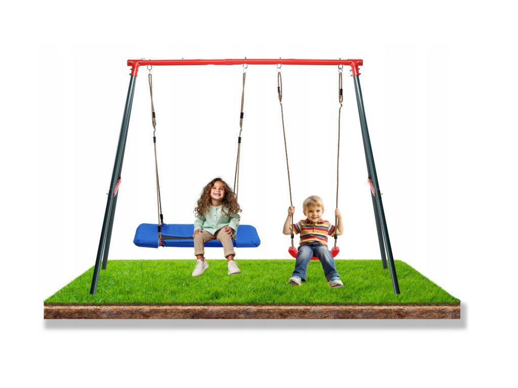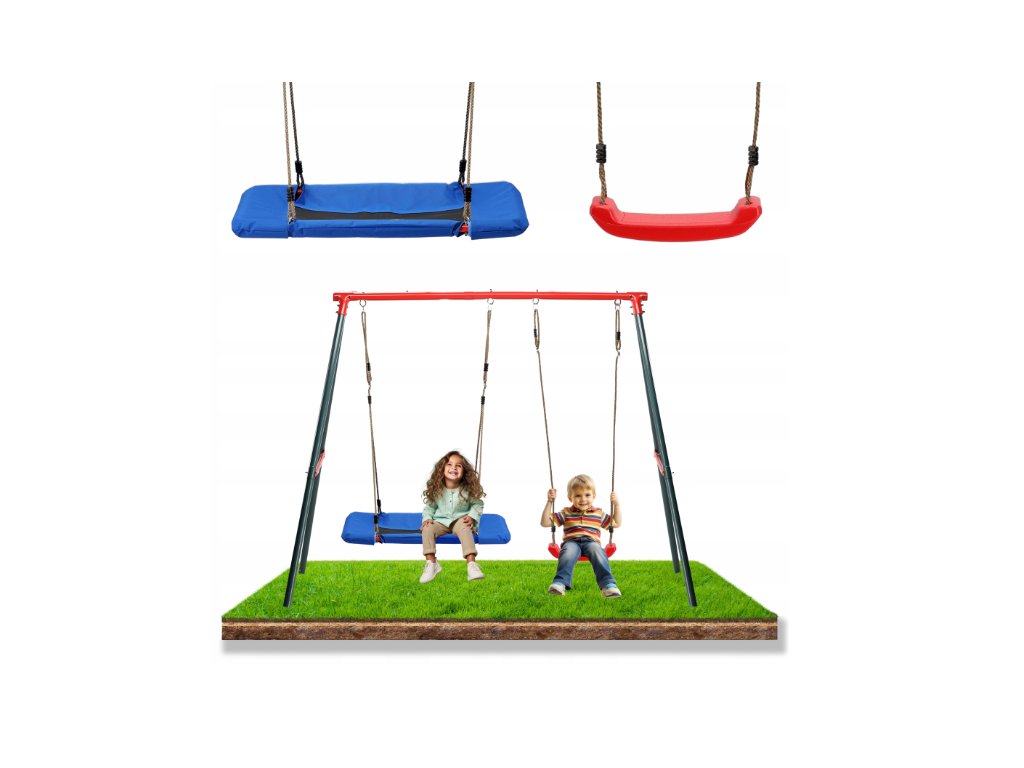 Dětská zahradní houpačka 2 v 1 spojuje dva různé herní prvky v jednom stabilním rámu.