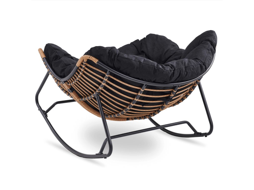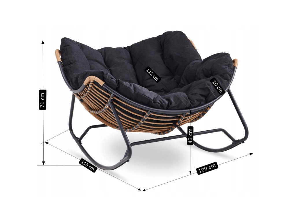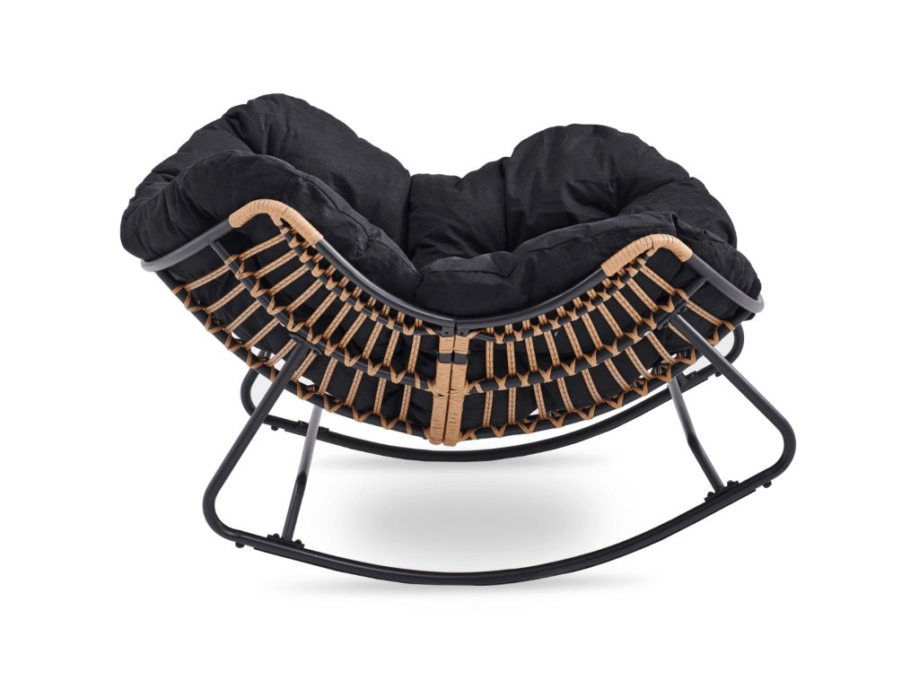 Základem je pevná kovová konstrukce, která poskytuje stabilitu i při dlouhodobém používání. Houpací lyžiny umožňují plynulé pohyby bez vrzání a díky černému rámu s práškovým lakováním je křeslo připraveno i na venkovní podmínky.