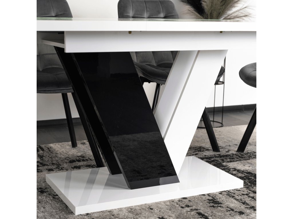 Nohy stolu jsou navrženy ve tvaru „V“ a osazeny na obdélníkovém podstavci. Konstrukce kombinuje bílou a černou barvu s lesklým povrchem, což stolu dodává moderní vzhled a jedinečný design. Kromě estetického hlediska poskytuje konstrukce výjimečnou stabilitu, což je důležité zejména při rozloženém stole.