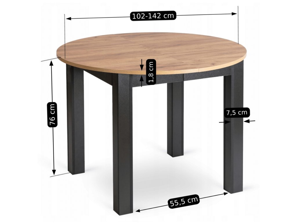 Stůl Harry má v základním stavu průměr 102 cm, což je ideální velikost pro každodenní stolování. Po rozložení na 142 cm poskytne pohodlný prostor pro rodinu i hosty. Rozkládací mechanismus je jednoduchý a vhodný pro běžné domácí používání.
