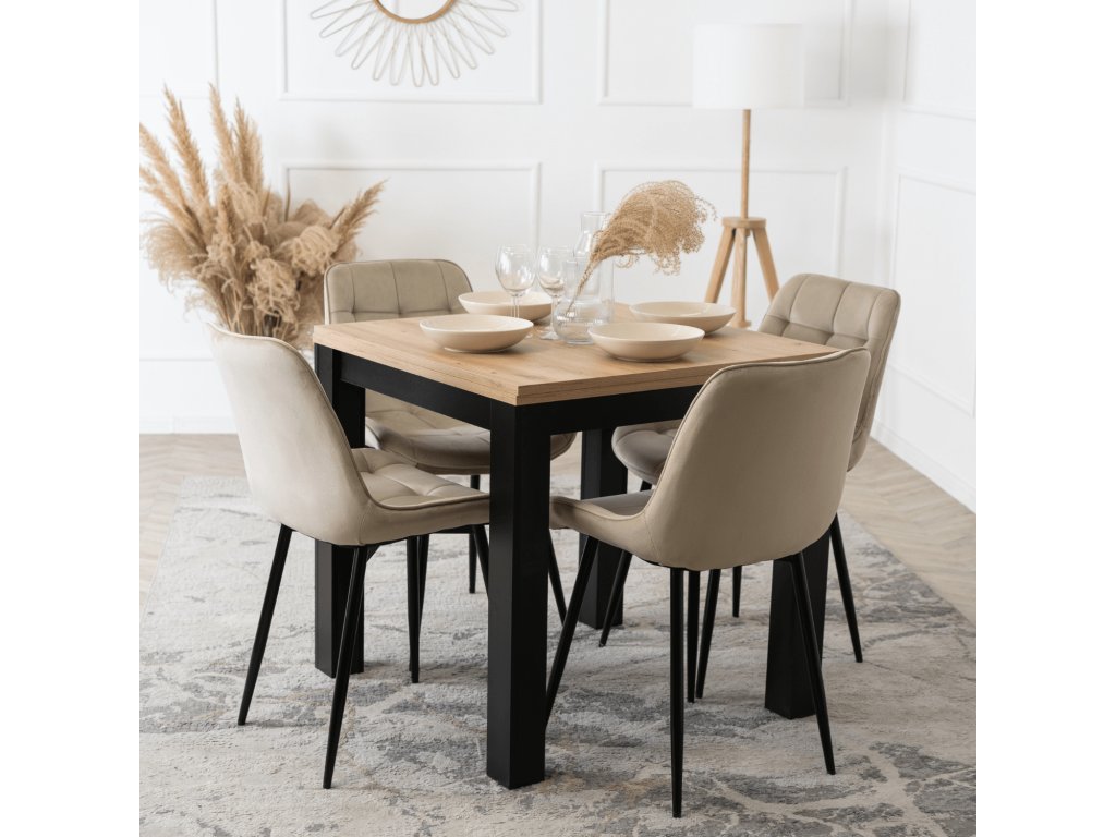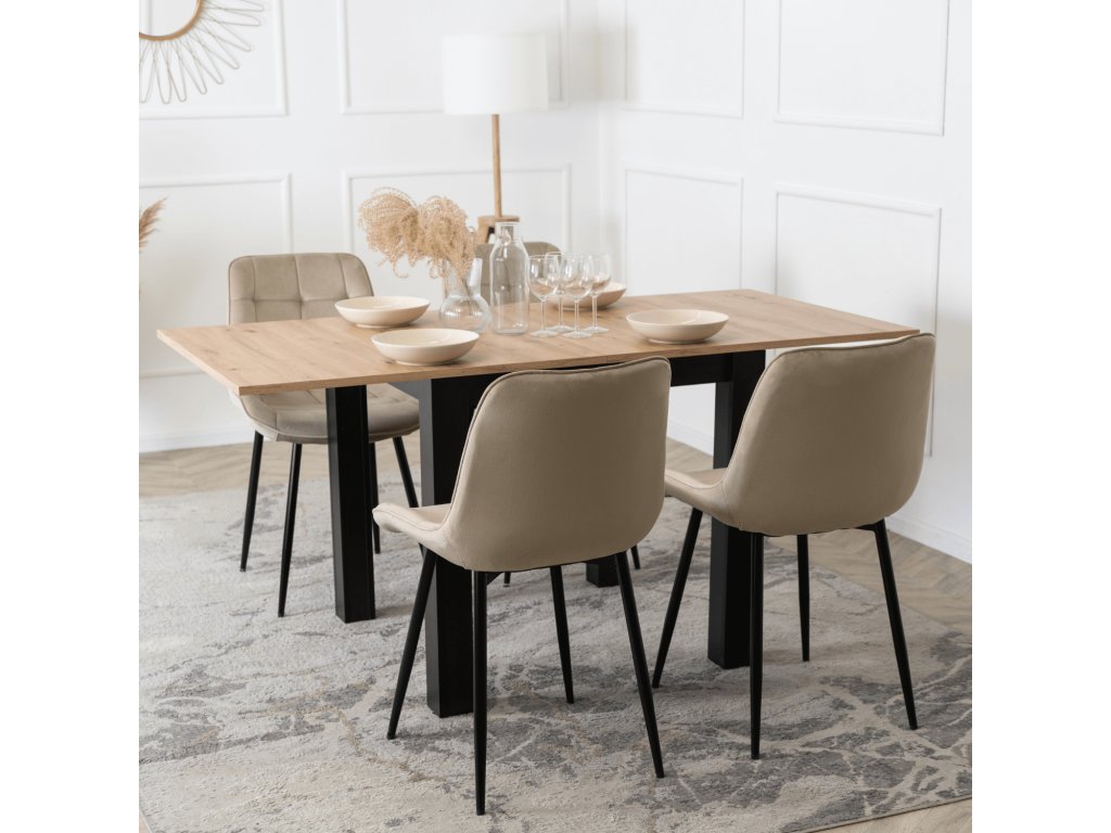 Sestava Max a Chris je navržena pro reálné používání v českých domácnostech. Rozkládací čtvercový stůl umožňuje během chvíle zvětšit stolovací plochu z běžného provozu na plnohodnotné místo pro rodinné setkání. Povrch v dekoru řemeslného dubu působí teple a nenápadně, snadno se udržuje a dobře snáší každodenní zatížení.