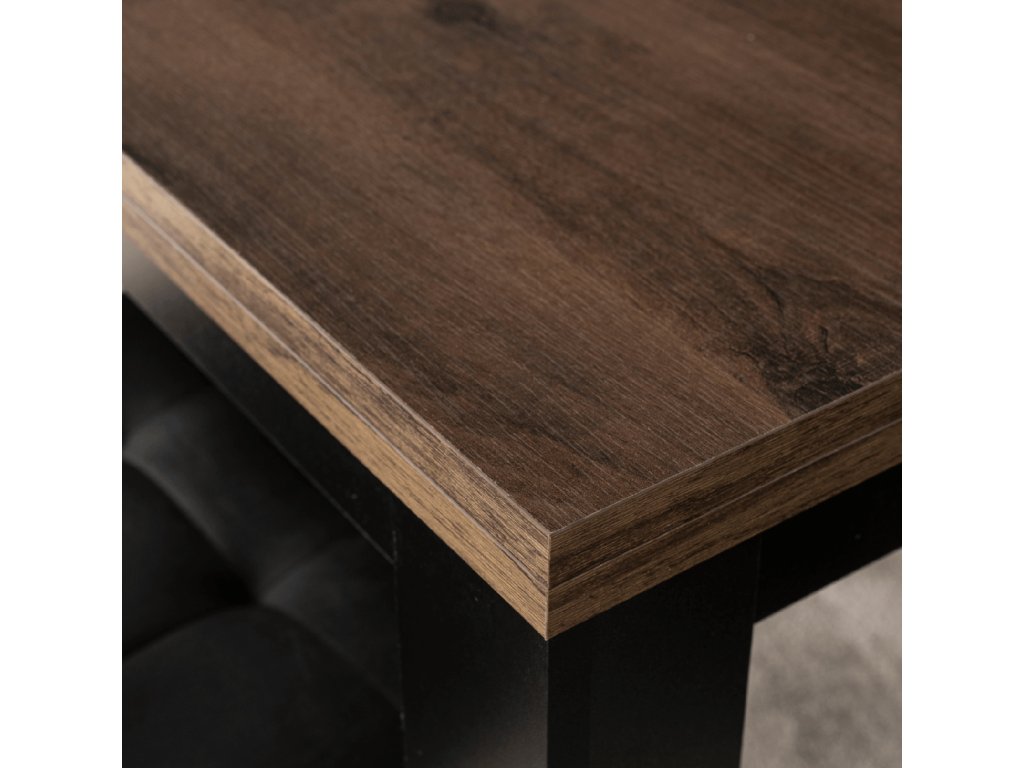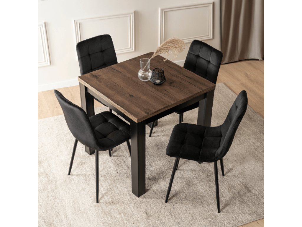 Tato jídelní sestava je navržena pro běžné české bydlení, kde je důležitý každý centimetr prostoru. Kompaktní rozměr stolu nezabírá místo při každodenním provozu, přesto nabízí možnost rychlého rozložení. Barevná kombinace ořechu a černé působí klidně, nadčasově a snadno se kombinuje s ostatním nábytkem.