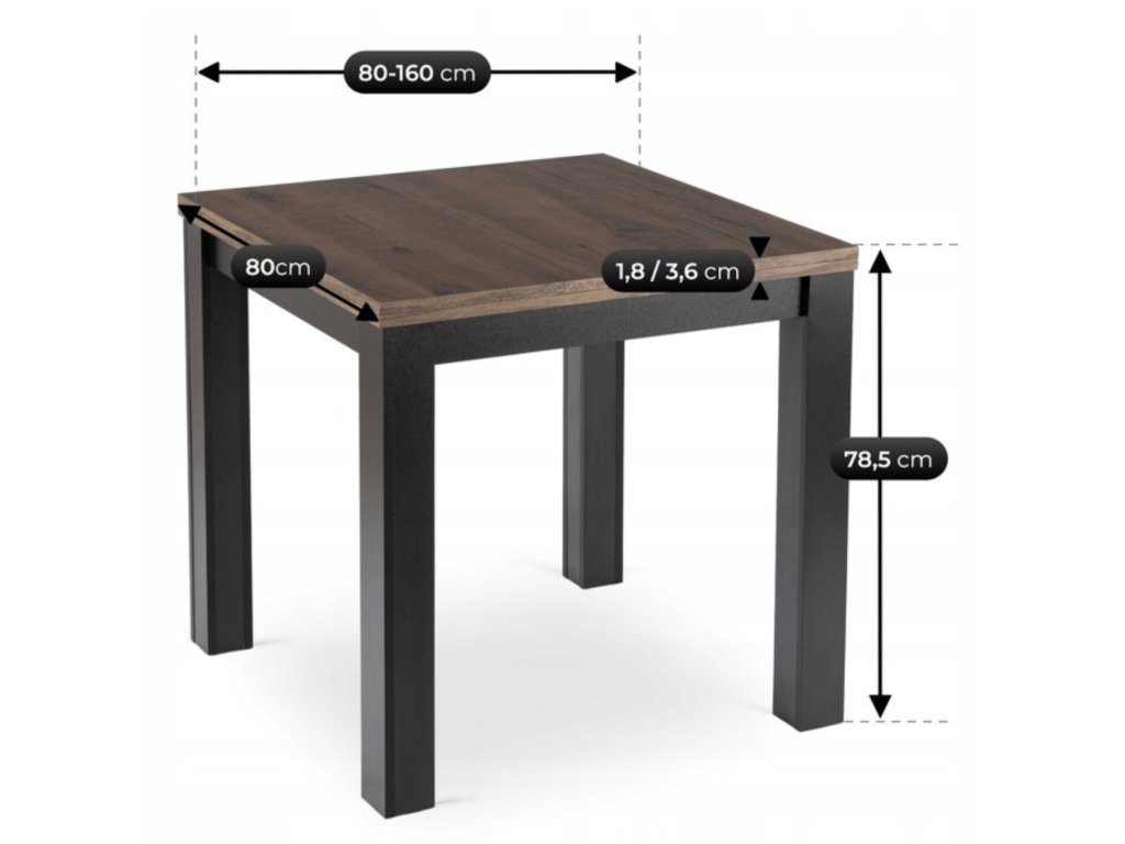 Stůl Max má v základním stavu rozměr 80 × 80 cm, který je ideální do menších kuchyní nebo bytů. Díky rozkládacímu systému typu „kniha“ jej během chvíle rozložíte na délku 160 cm. To znamená pohodlné stolování pro více osob bez nutnosti trvale velkého stolu.