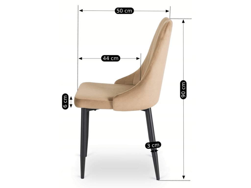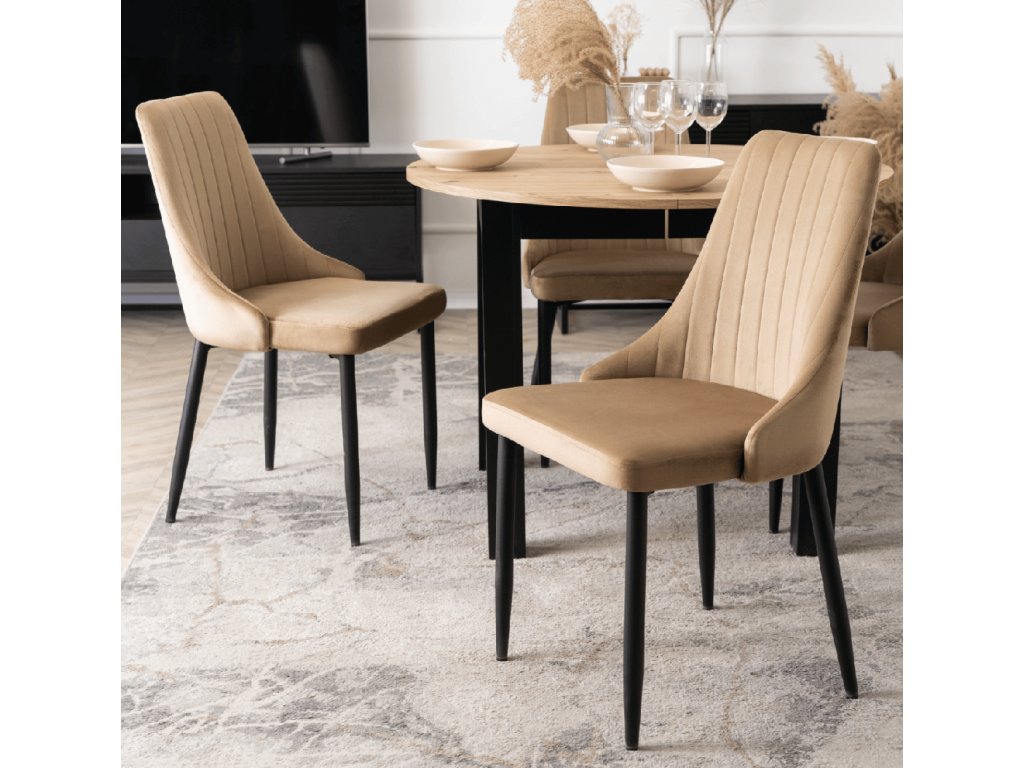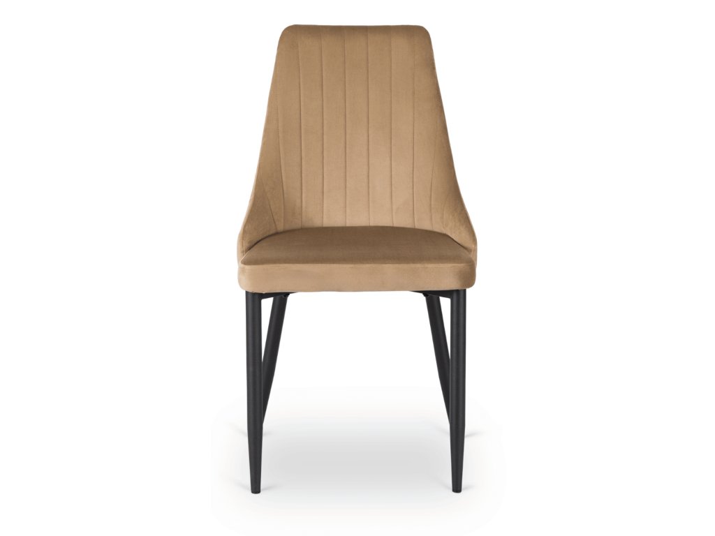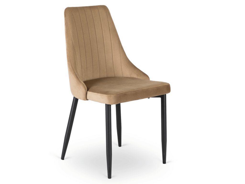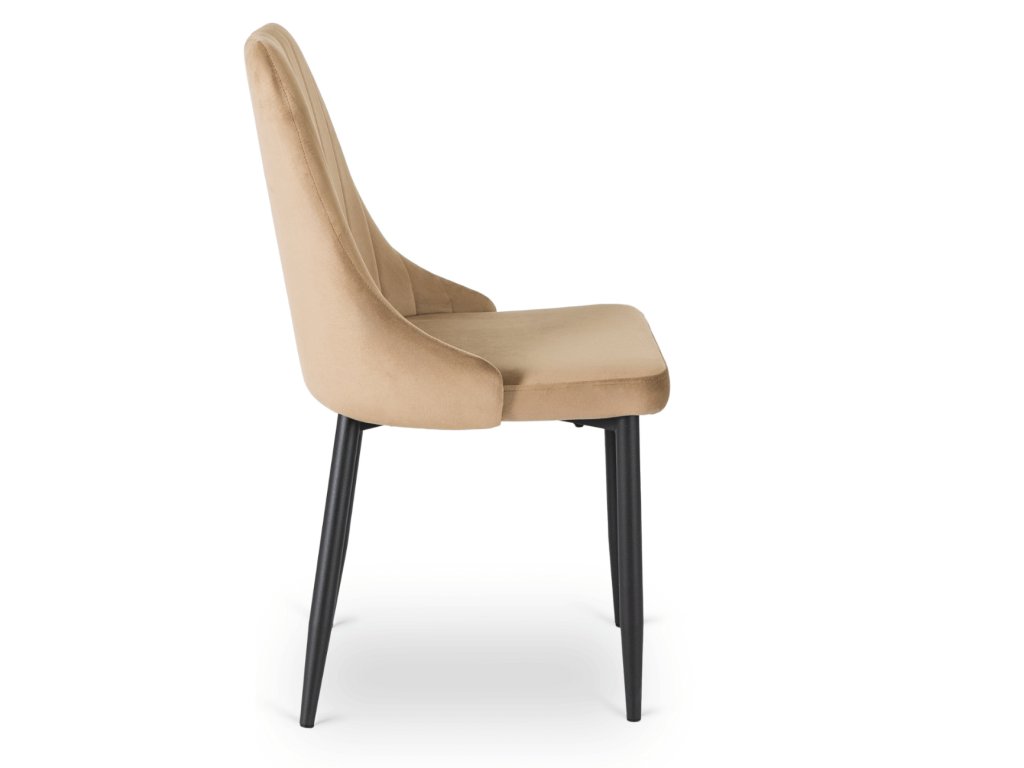Zamatové čalounění vytváří měkký, hřejivý dojem a je příjemné pro každodenní používání. Světlý béžový odstín působí neutrálně a snadno se kombinuje se dřevem, kovem i minimalistickými materiály. Jemné vertikální prošívání na opěradle dodává židli vizuální hloubku bez okázalosti a zároveň podporuje přirozenou oporu chrbtice při sezení.