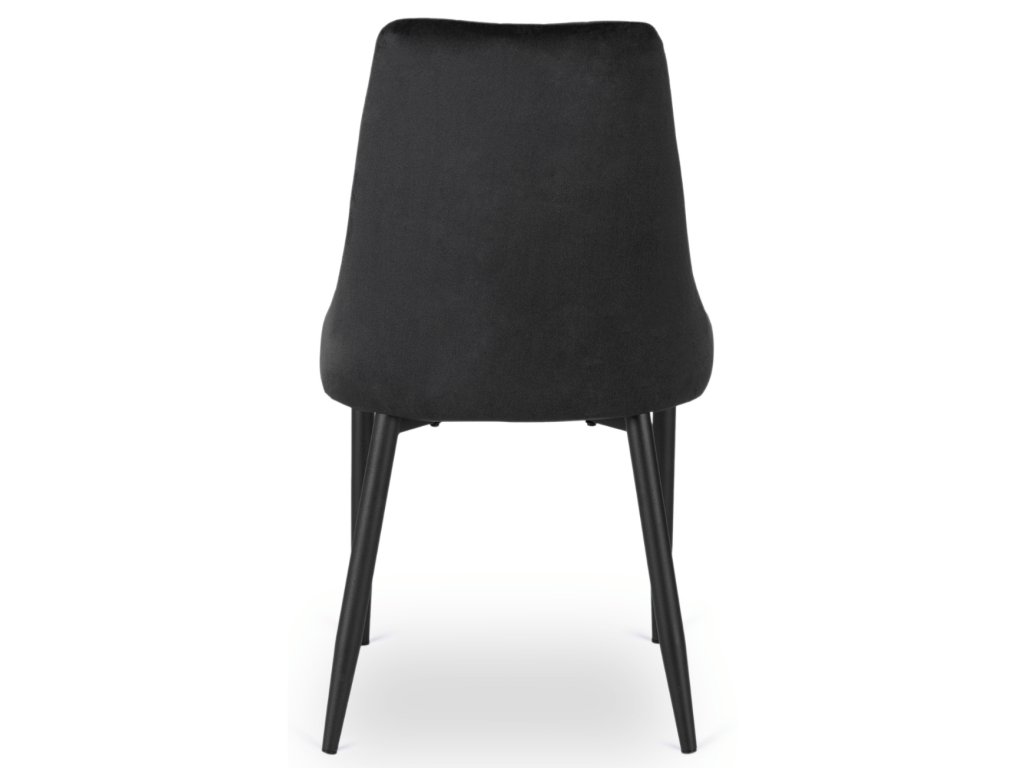 Základem židle je stabilní ocelová konstrukce v černém provedení, která zajišťuje pevnost a jistotu při sezení. Úzké nohy působí vizuálně lehce, ale jsou navrženy tak, aby zvládly běžnou zátěž v domácnosti. Absence loketních opěrek umožňuje snadné zasunutí židle pod stůl, což je ideální řešení do menších prostor.