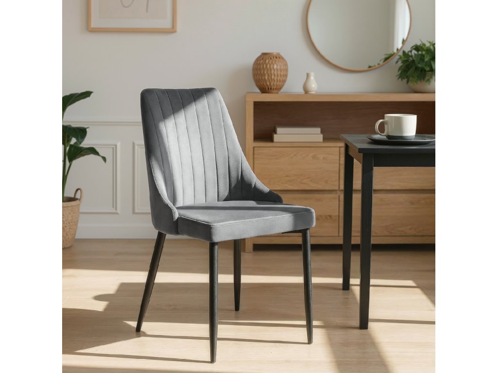 Sedací část je čalouněná jemným velurem, který je měkký na dotyk a příjemný i při delším sezení. Tento materiál oceníte při každodenních rodinných večeřích, práci u stolu nebo posezení s návštěvou. Jemné prošívání na opěrce dodává židli elegantní vzhled a zároveň podtrhuje její moderní charakter, aniž by působila přehnaně výrazně.