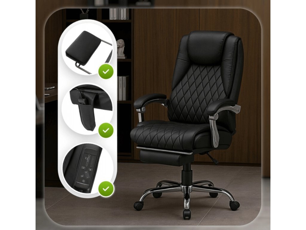 Čalounění z černé eko kůže působí profesionálně a hodí se jak do kanceláře, tak do domácí pracovny. Povrch je praktický na údržbu a vhodný pro každodenní používání. Měkká výplň sedáku a opěradla zajišťuje komfort při dlouhodobém sezení, zatímco pevná konstrukce poskytuje stabilitu bez nepříjemného propadání.