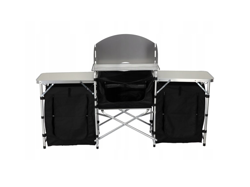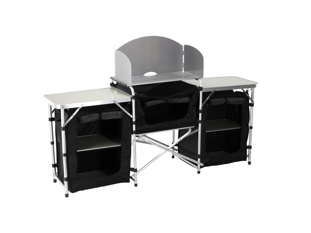 Kempingová kuchyně se po rozložení změní na stabilní pracovní stanici se třemi samostatnými plochami pro přípravu jídla, vaření a odkládání vybavení. Konstrukce z hliníku a MDF desek zajišťuje pevnost i v terénních podmínkách.