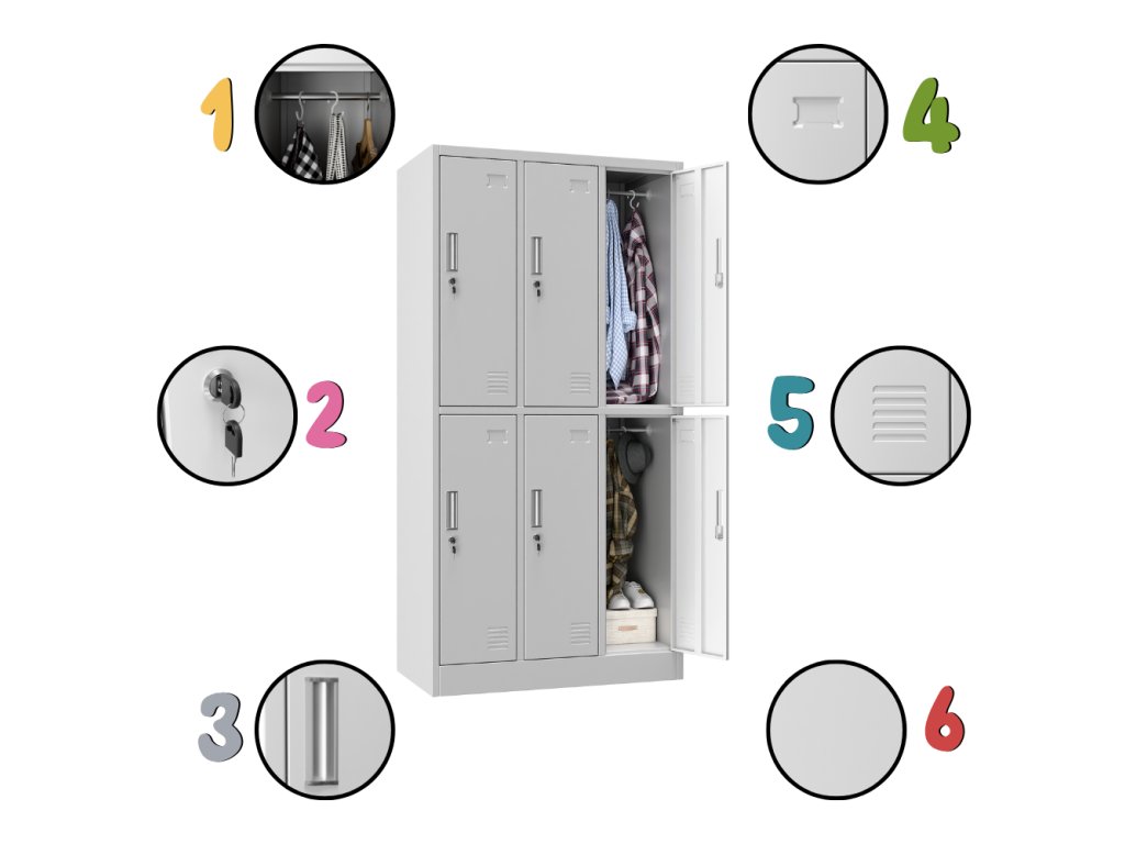 Dveře mají perforaci nebo mřížku, která zajišťuje dostatečné větrání a zabraňuje vzniku plísní. Každé dveře jsou vybaveny místem pro jmenovku a zámkem se dvěma klíči.