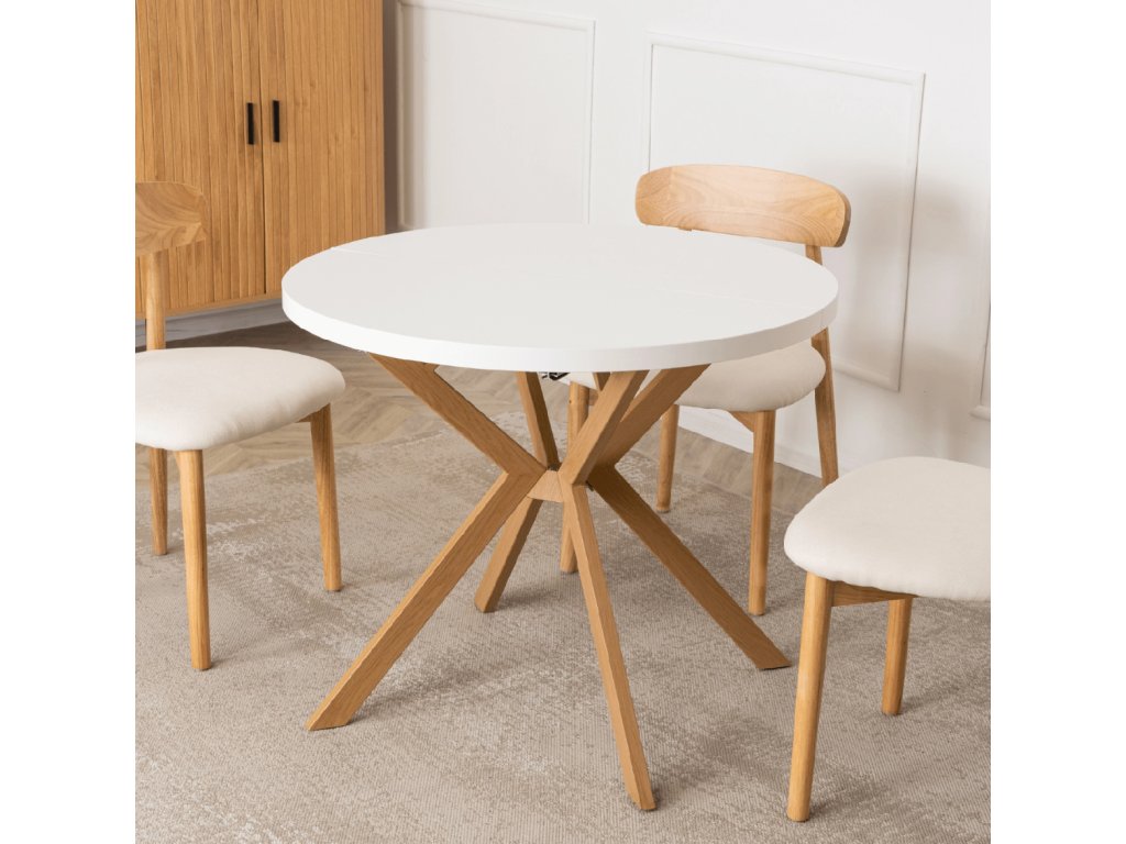 Kulatý rozkládací jídelní stůl bílý 90 – 190 cm dub Lugo je ideální tam, kde se střídá běžné každodenní používání s občasnými návštěvami. Není určen jako pevné řešení pro osm osob každý den, ale jako flexibilní stůl, který se přizpůsobí aktuální potřebě bez nutnosti dalšího nábytku nebo kompromisů v prostoru.