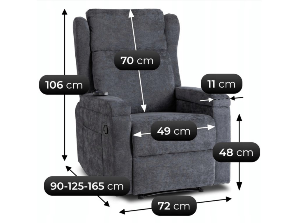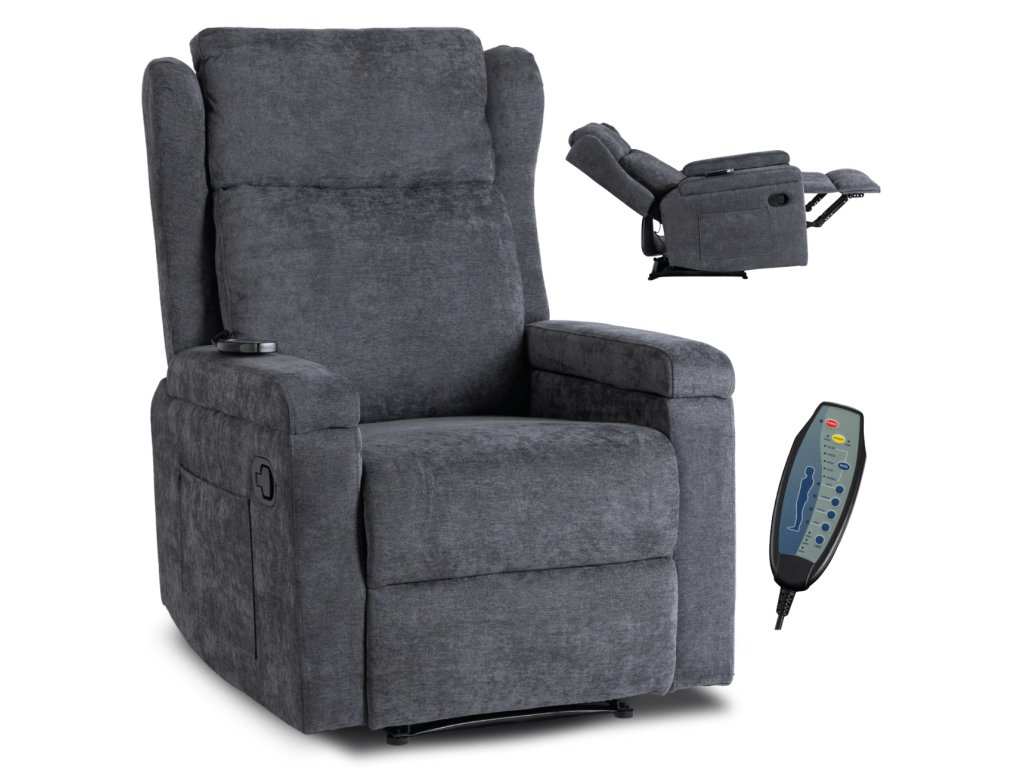 Díky masážní funkci si můžete dopřát uvolnění v oblasti nohou, stehen, bederní části i zad. Ovládání probíhá jednoduše přes dálkový ovladač, kde si zvolíte intenzitu i dobu masáže podle potřeby. Praktické detaily, jako otevírací područky s úložným prostorem a nastavitelná opěrka nohou, zvyšují komfort při každém použití.