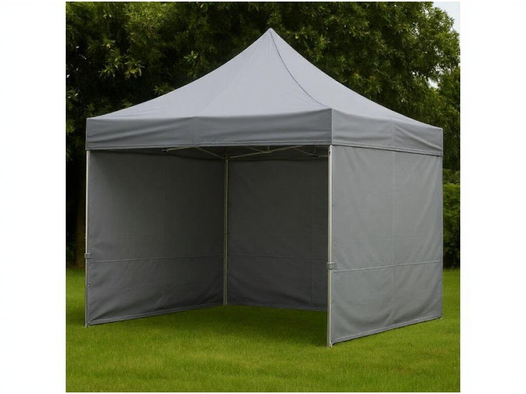 Nůžkový stan 3 × 3 šedý, hmotnost: 28 kg, výška nastavitelná 190 až 220 cm, hliníková konstrukce, stabilní 6hranná noha, nepromokavá střecha 820D (400 g/m²), boční stěny 420D (165 g/m², 3 kusy), rozměry složeného stanu 160 × 25 × 25 cm