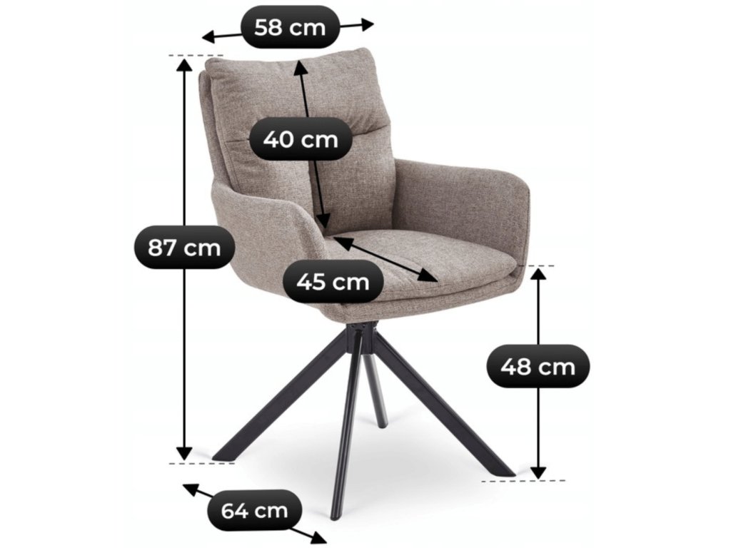 Sedací část má otočný mechanismus 90° na obě strany a přináší zcela nový rozměr pohodlí. Už žádné odsouvání od stolu, stačí se otočit a pohodlně vstát. Měkký polštář se silným čalouněním zajistí komfort i při delším sezení. Díky modernímu vzhledu a funkčnosti je židle ideální nejen do domácnosti, ale také do restaurací, hotelů či kaváren, kde hosté ocení kombinaci elegance a praktického využití.