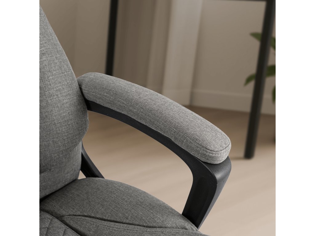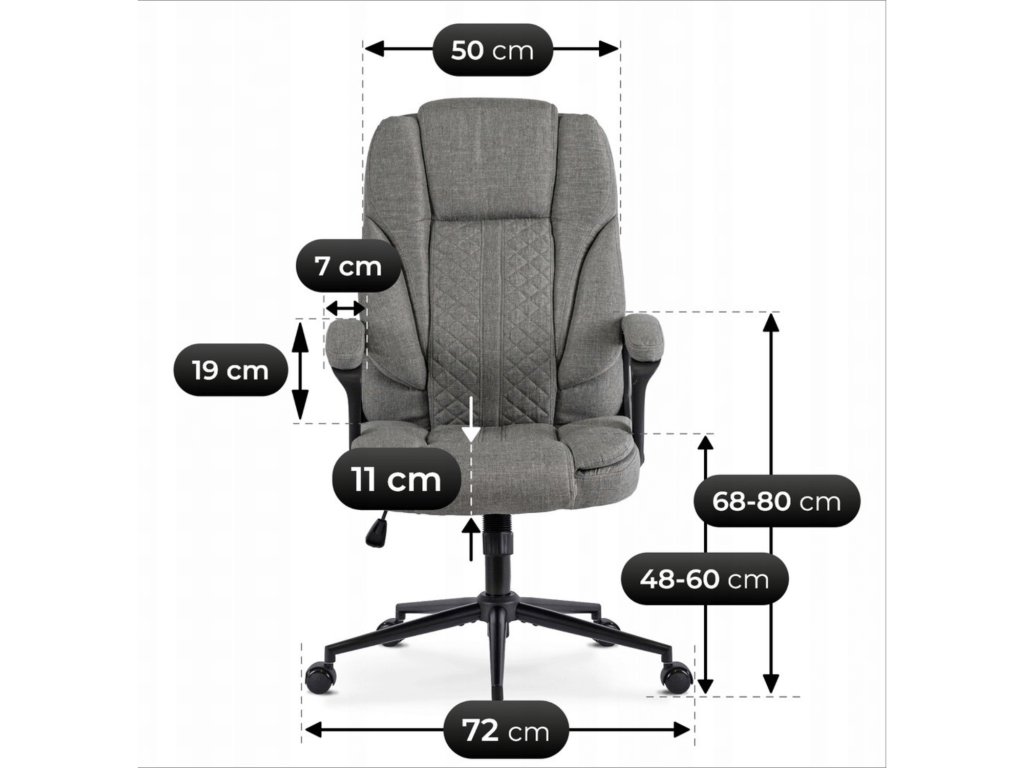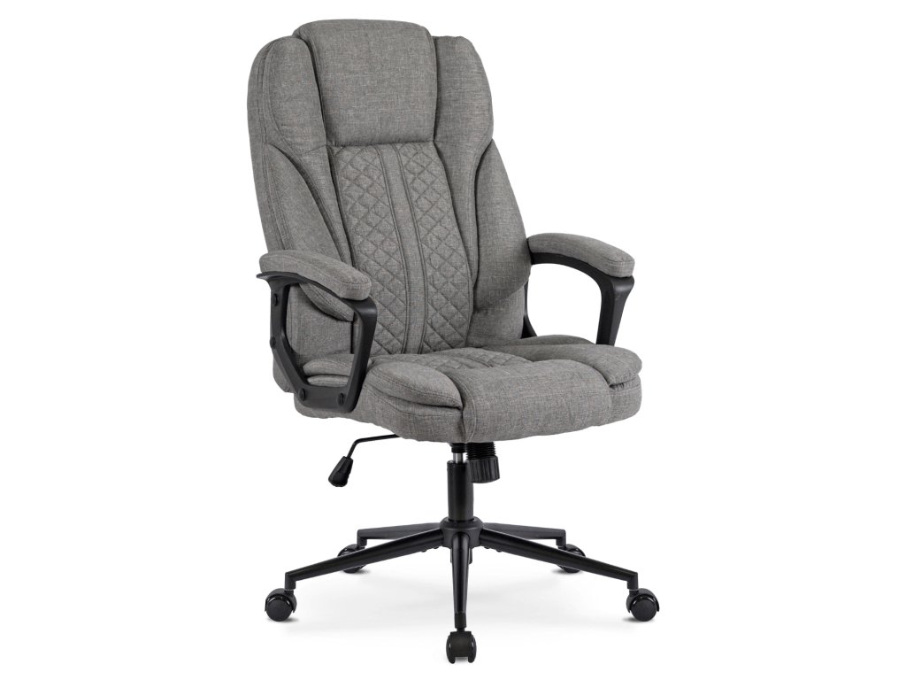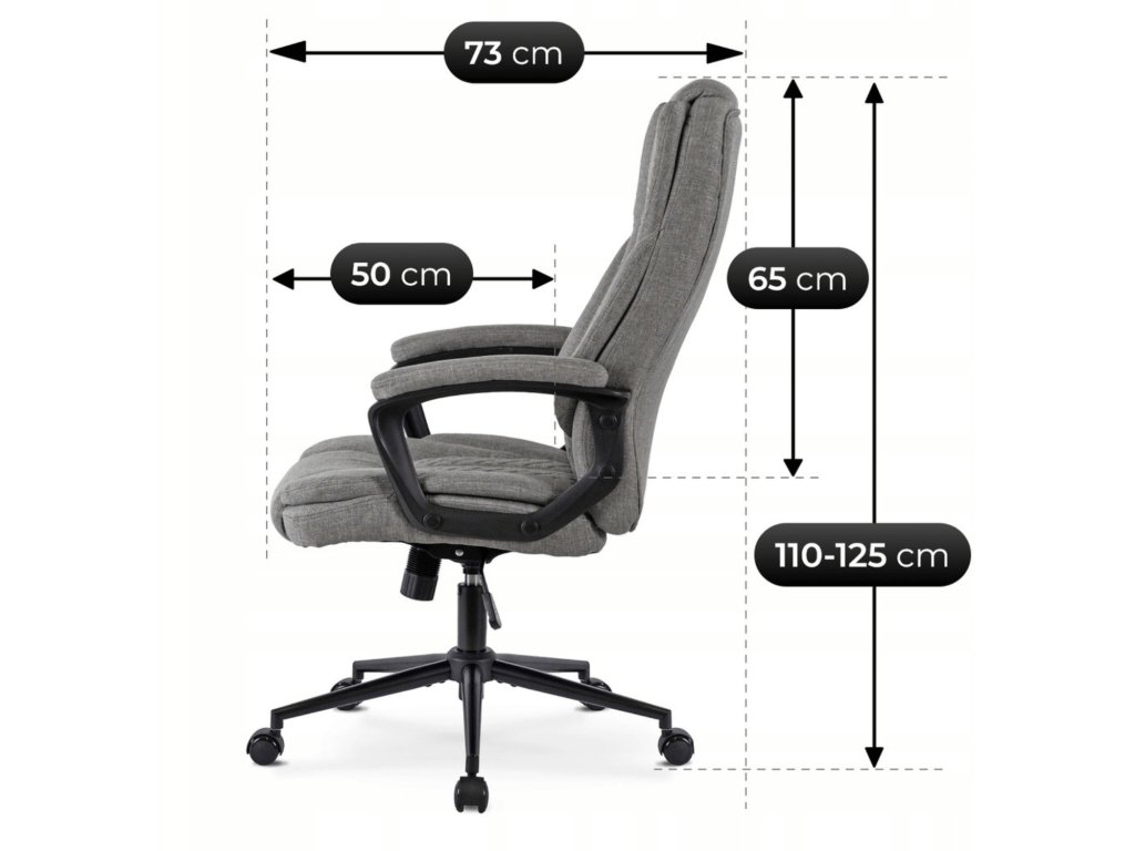 Sedák i opěradlo jsou potaženy kvalitní šedou látkou, která je příjemná na dotek a odolná při každodenním používání. Pevná plastová konstrukce v černém provedení zajišťuje stabilitu a dlouhodobou spolehlivost i při maximálním zatížení 150 kg.