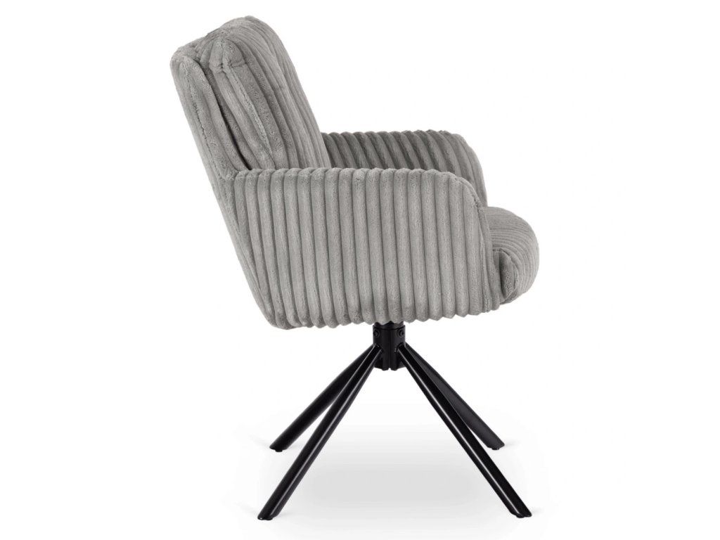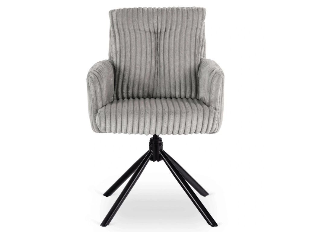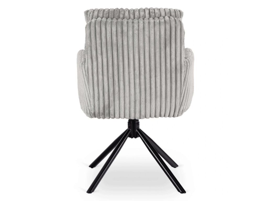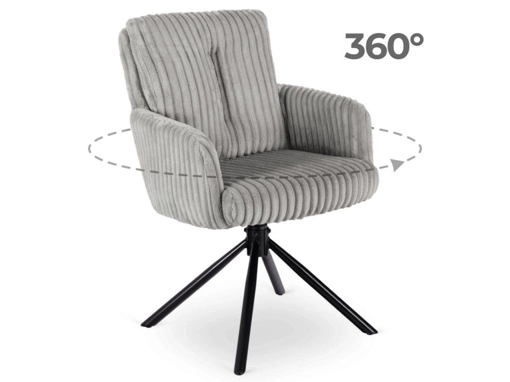 Táto jedálenská stolička spája komfort, funkčnosť a nadčasový dizajn v jednom celku. Mäkký manšestrový poťah prináša príjemný pocit pri sedení, zatiaľ čo pevná kovová konštrukcia zabezpečuje stabilitu pri každodennom používaní. Otočný mechanizmus 360° spolu s automatickým návratom zvyšuje pohodlie pri stolovaní a zároveň udržiava priestor vizuálne moderný. Tvarovanie sedadla a opierky podporuje prirodzené držanie chrbtice, čo oceníte pri dlhšom sedení. Ide o praktickú voľbu do moderných interiérov, kde sa kladie dôraz na pohodlie, jednoduché používanie a čistý dizajn.