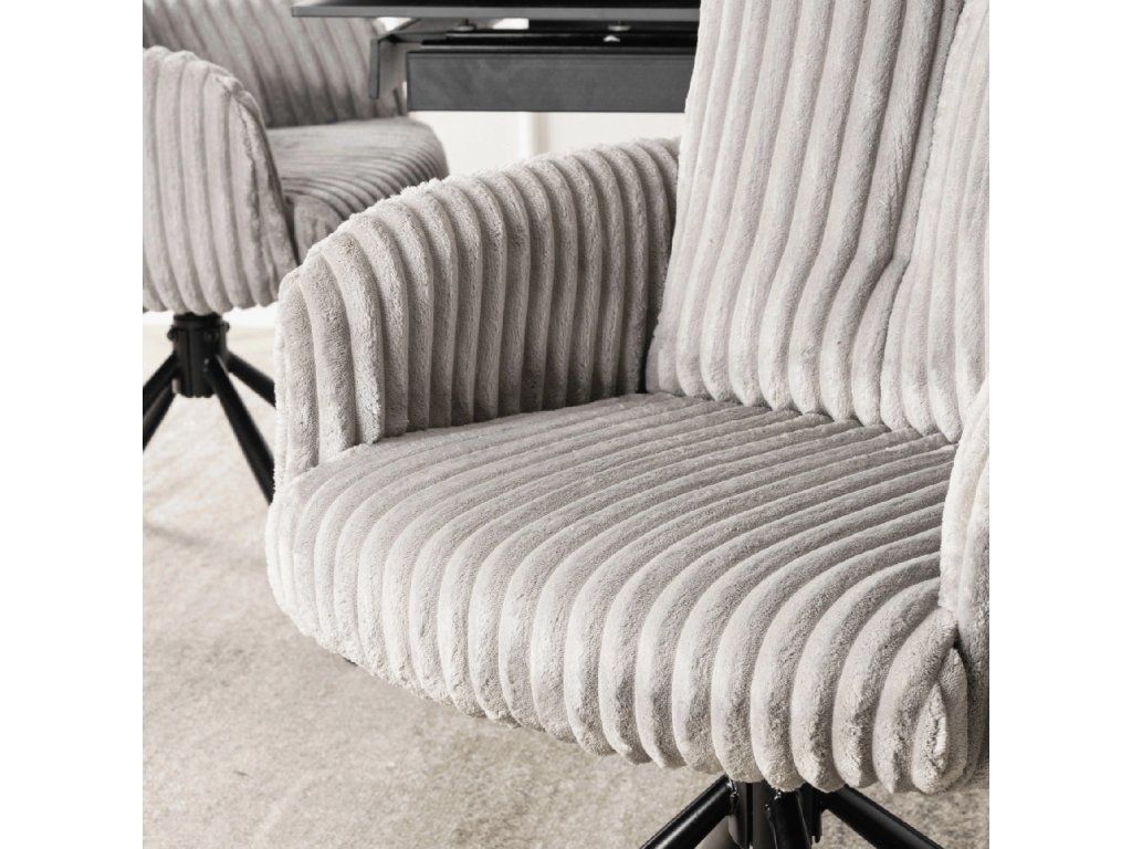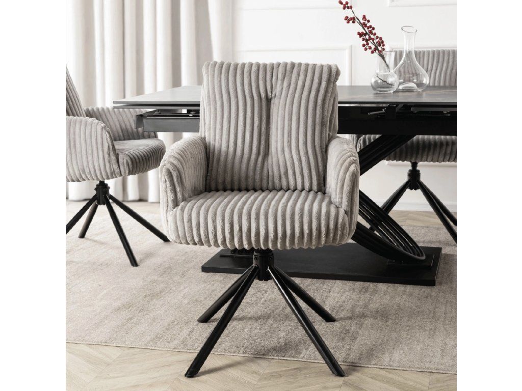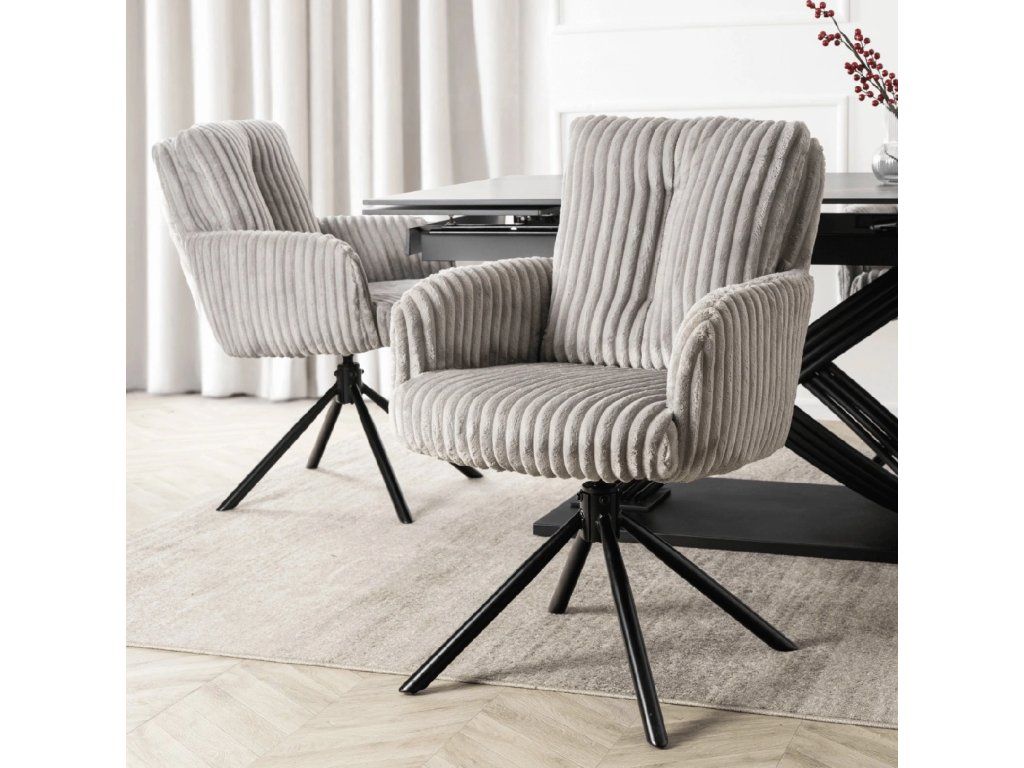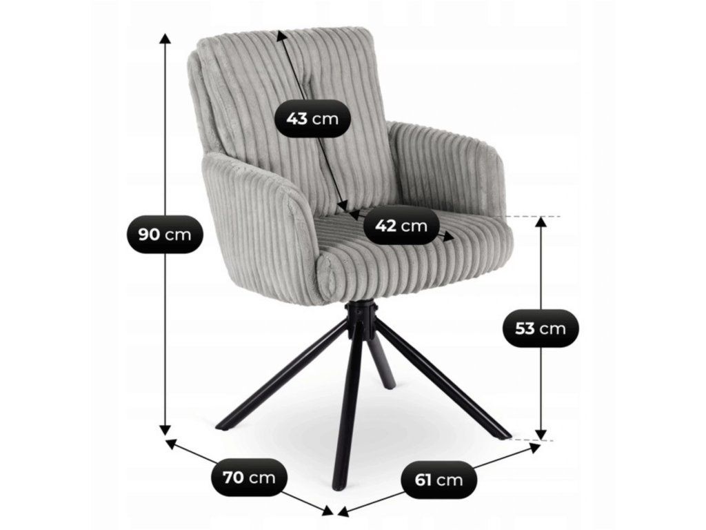 Táto jedálenská stolička spája komfort, funkčnosť a nadčasový dizajn v jednom celku. Mäkký manšestrový poťah prináša príjemný pocit pri sedení, zatiaľ čo pevná kovová konštrukcia zabezpečuje stabilitu pri každodennom používaní. Otočný mechanizmus 360° spolu s automatickým návratom zvyšuje pohodlie pri stolovaní a zároveň udržiava priestor vizuálne moderný. Tvarovanie sedadla a opierky podporuje prirodzené držanie chrbtice, čo oceníte pri dlhšom sedení. Ide o praktickú voľbu do moderných interiérov, kde sa kladie dôraz na pohodlie, jednoduché používanie a čistý dizajn.