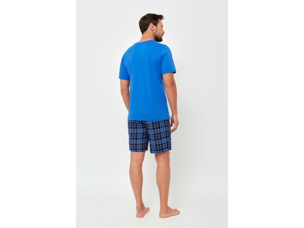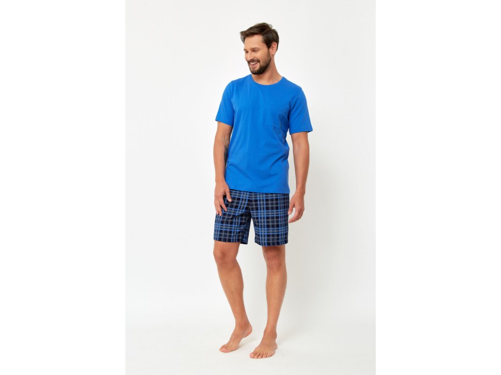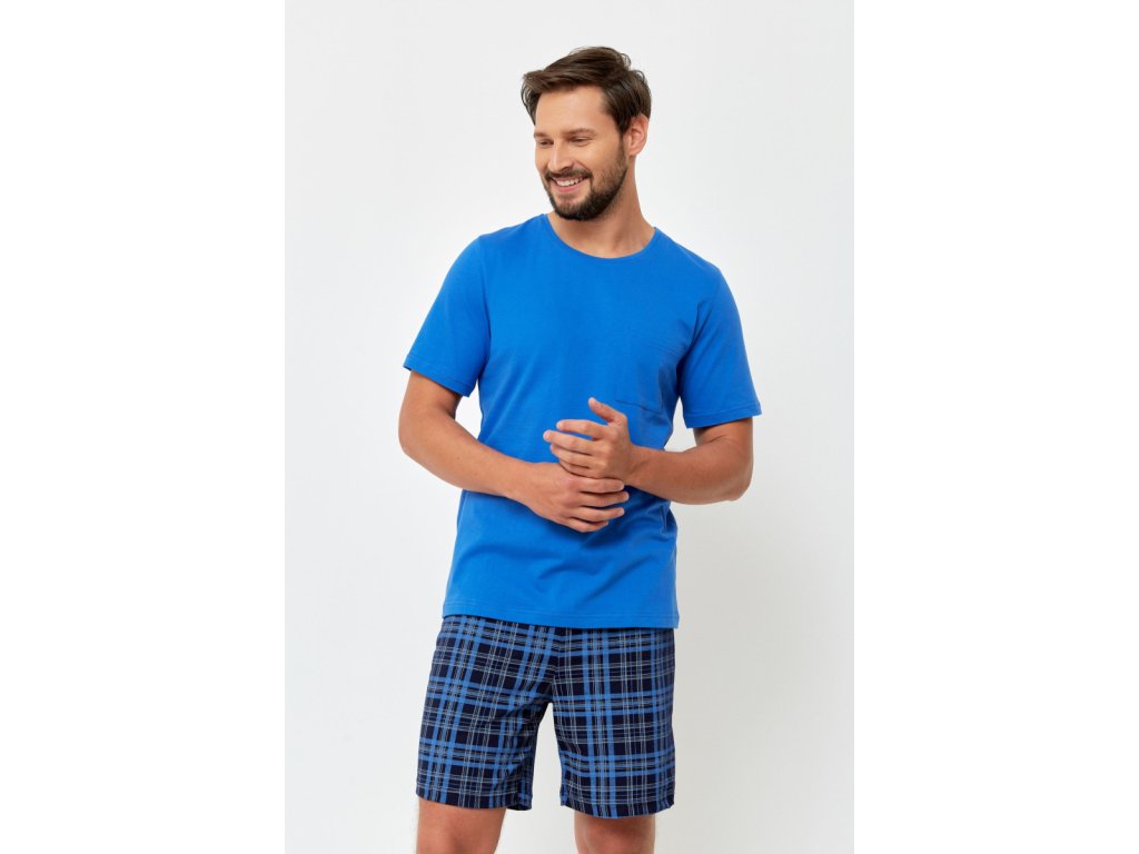 Jednobarevné tričko s kulatým výstřihem a krátkým rukávem doplňují kraťasy s károvaným vzorem a elastickým páskem. Spolu vytvářejí moderní vzhled, který se hodí na běžné nošení i noční odpočinek.