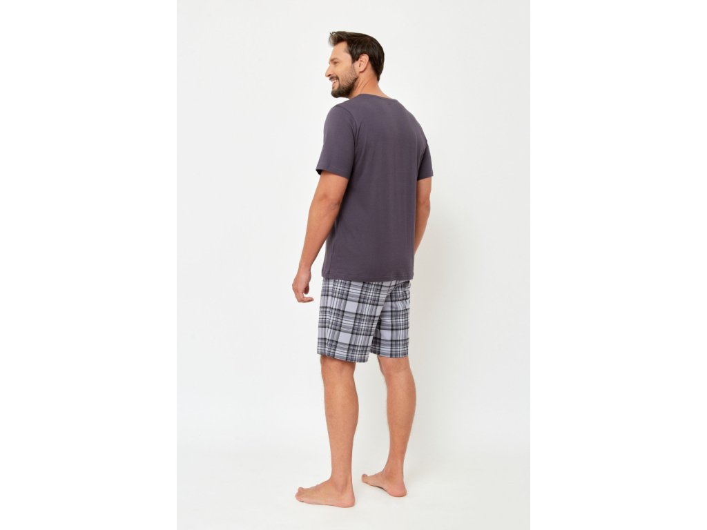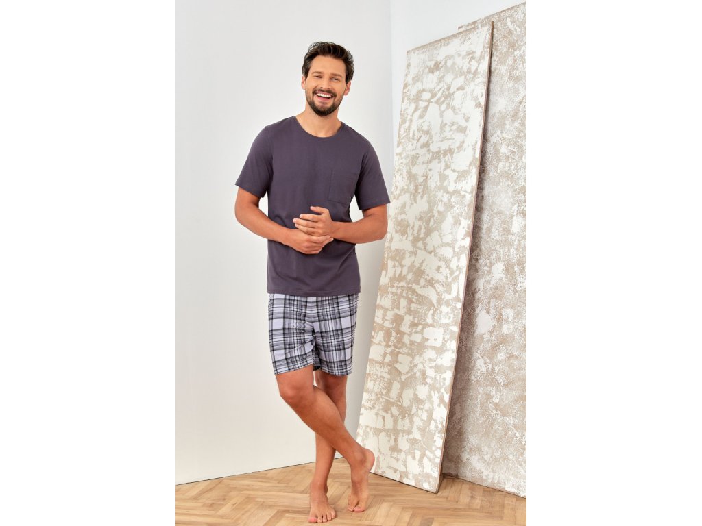 Jednobarevné tričko s kulatým výstřihem a krátkým rukávem doplňují kraťasy s károvaným vzorem a elastickým pasem. Společně vytvářejí moderní vzhled, který se hodí na běžné nošení i noční odpočinek.