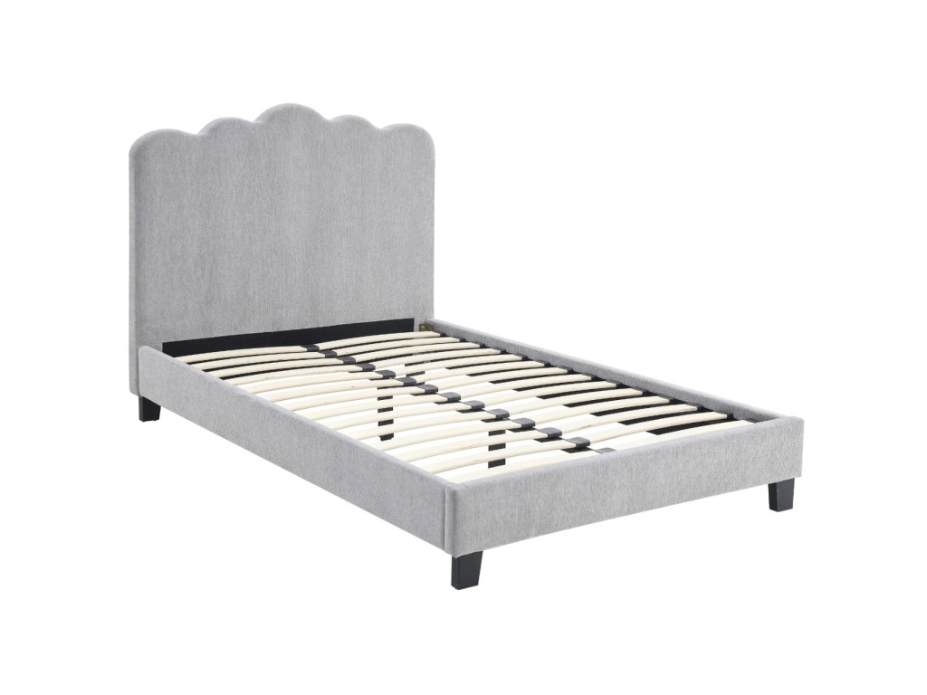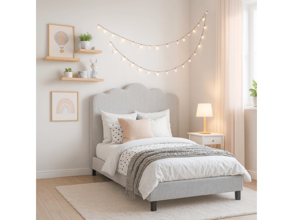 Příjemná šedá látka působí elegantně, nadčasově a snadno se kombinuje s bílým nábytkem, pastelovými odstíny i minimalistickým interiérem. Měkké čalouněné čelo poskytuje pohodlnou oporu při čtení, učení nebo práci na notebooku a dodá pokoji útulnou atmosféru.