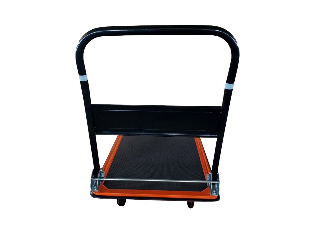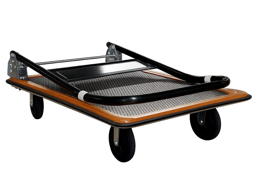 Základem skládacího manipulačního vozíku WM04 je pevná kovová platforma s protiskluzovým povrchem, která udržuje náklad stabilní i při zatížení až 300 kg. Po obvodu platformy 47 × 73 cm je umístěna gumová ochranná lišta, která tlumí nárazy při kontaktu se stěnami, regály nebo dveřmi a zároveň chrání přepravovaný materiál před poškozením. Hmotnost vozíku 7,5 kg přispívá k vyváženému vedení a dobré kontrole pohybu.