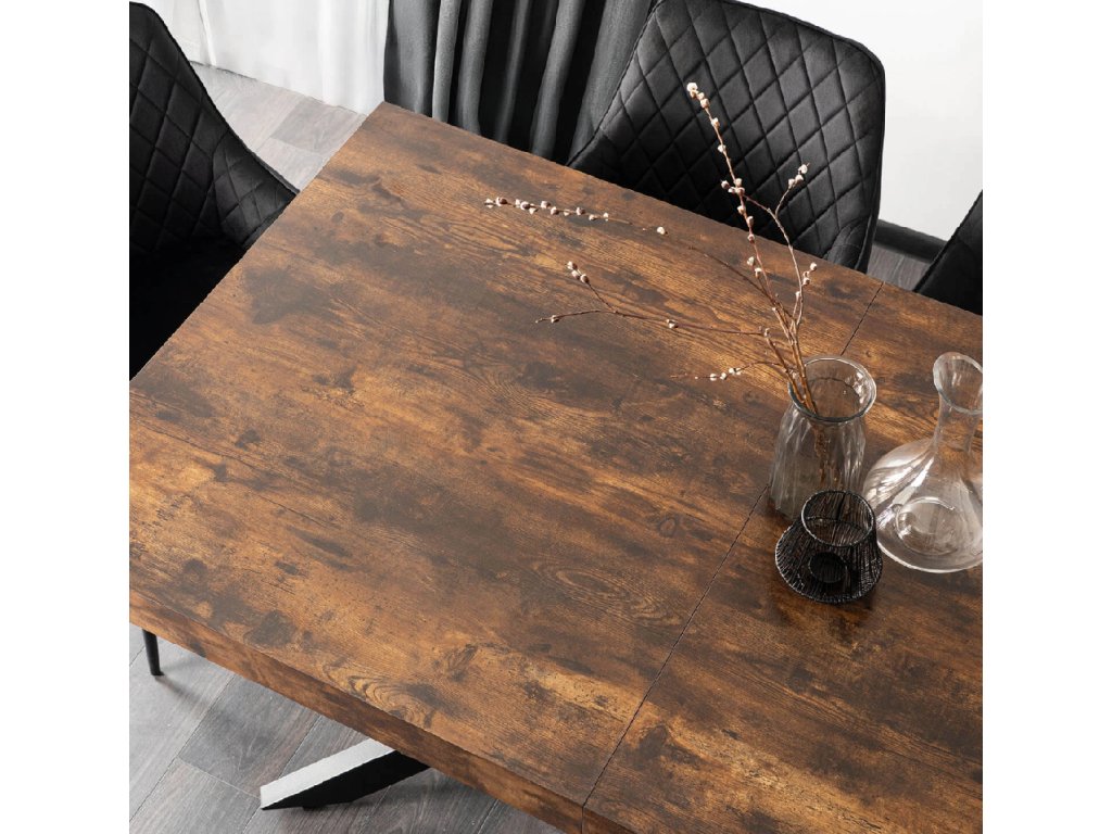 Stůl má základní délku 160 cm, díky dvojitému výsuvnému systému se snadno rozšíří až na 240 cm. Vložky jsou uloženy přímo pod deskou, takže je máte vždy po ruce. Rozkládací mechanismus je plynulý a zvládnete ho bez námahy – ideální pro hosty nebo oslavy.