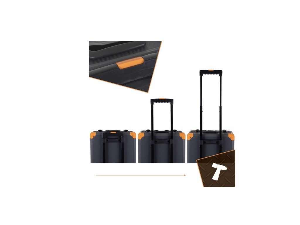 Robustní hliníkový kufr je vybaven kolečky a vysouvací teleskopickou rukojetí, takže svou dílnu přesouváte stejně snadno jako cestovní zavazadlo. Kovové zámky s klíči navíc zajistí, že vaše nářadí zůstane v bezpečí před nepovolanými osobami nebo při převozu v autě.