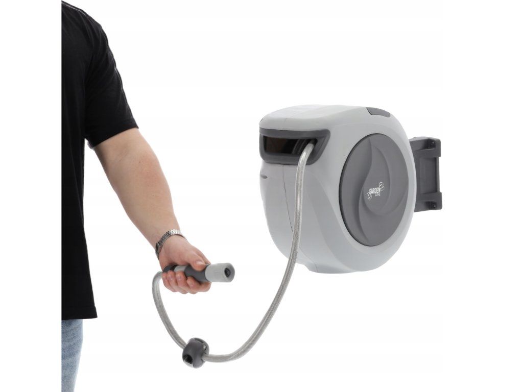 Zařízení funguje na principu mechanického pohonu se silnou pružinou, která se postará o plynulý zpětný chod hadice bez potřeby elektřiny. Slouží k pohodlnému zavlažování s možností aretace (zastavení) v jakékoliv délce, takže vás hadice při zalévání netahá zpět ke zdi. Vyřeší vám starosti s uskladněním příslušenství, které máte díky integrovanému držáku vždy na dosah ruky přímo na navijáku.