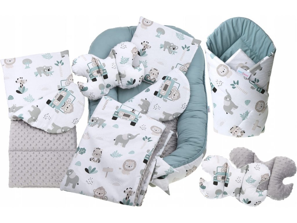 Sada do postýlky 7 dílná vzor safari barva šedá bílá modrá materiál bavlna minky v balení hnízdo antishock polštář přikrývka matrace plochý polštář zavinovačka bavlněný obal praní v pračce při teplotě 40 °C