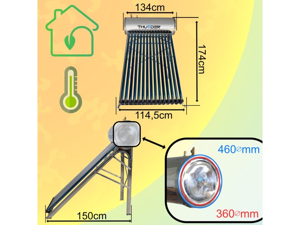 Solární kolektor využívá sluneční energii, která je obnovitelná a neznečišťuje životní prostředí. Slouží k ohřevu 100 l, 150 l a 200l vody pomocí sluneční energie až do 60 °C. Voda v nádrži je pod tlakem, takže ji můžete využívat stejně jako z běžného ohřívače vody. Má vysokou účinnost a dokáže efektivně ohřívat vodu i v méně slunečných dnech. Jedna vakuová trubice je zodpovědná za ohřev maximálně 10 l vody.