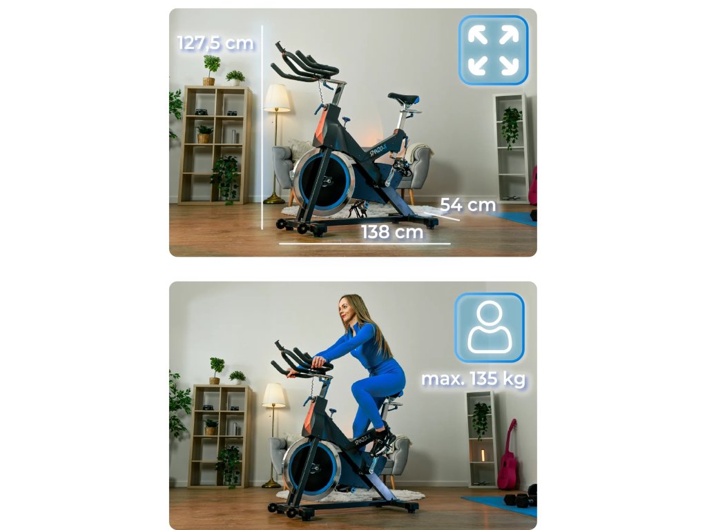 Stacionární kolo Spinzo-x, systém magnetického odporu: 16 úrovní, délka: 138 cm, šířka: 54 cm, výška: 127,5 cm, hmotnost produktu: 48 kg, maximální hmotnost uživatele: 135 kg