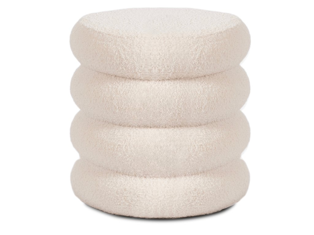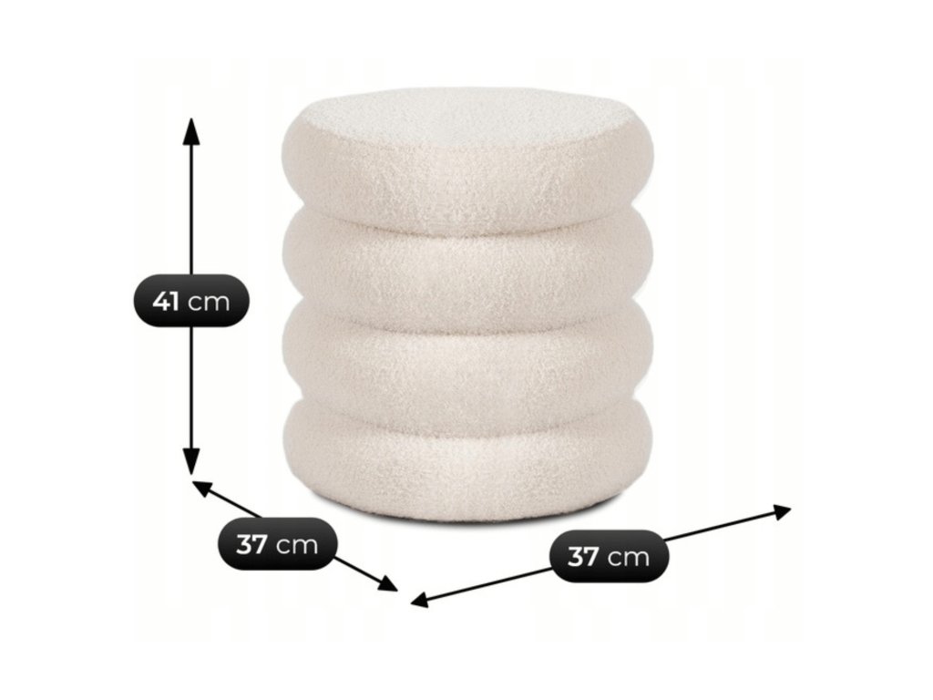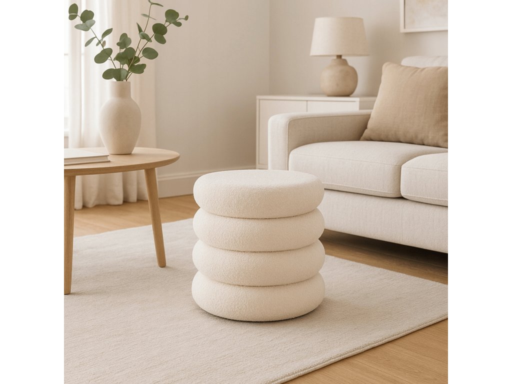 Puf je vyrobený z měkké buklé látky s jemnou texturou v krémové barvě. Jeho design se snadno kombinuje s různými styly interiéru od moderního až po klasický.