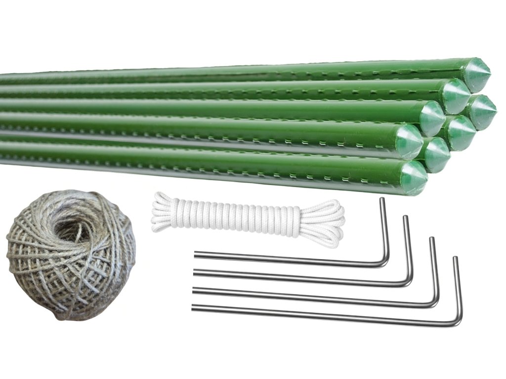 K fóliovníku získáte sadu pro ukotvení a podporu rostlin: kotvící kolíky, kotvící lanka, provázek a zelené opěrné tyče, které pomáhají sazenicím k pevnému a zdravému růstu.