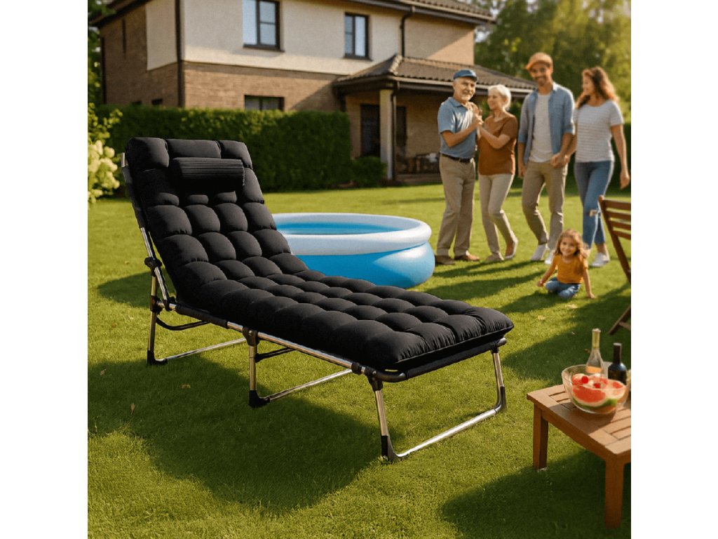 Díky nastavitelnému opěradlu si snadno zvolíte polohu podle aktuální potřeby – ať už chcete číst, relaxovat nebo si lehnout. Stabilní kovová konstrukce dodává jistotu při používání, zatímco měkký povrch zvyšuje pohodlí i při delším ležení.