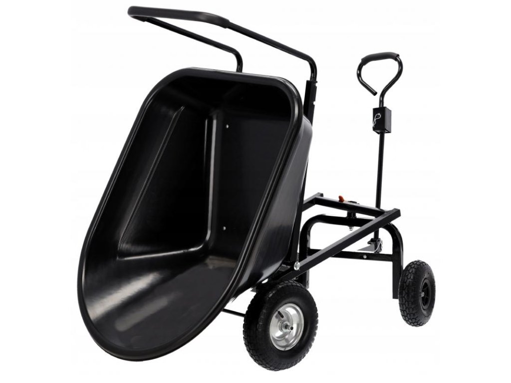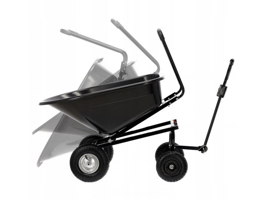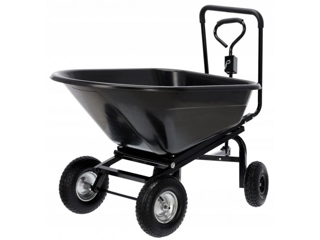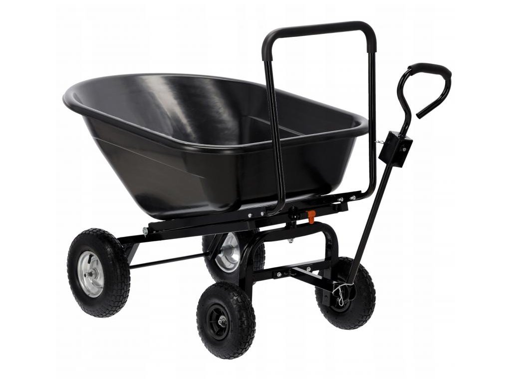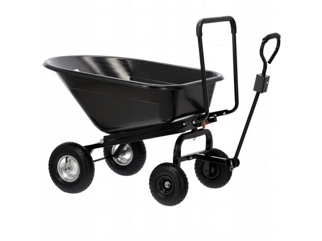 Vozík je osazen nafukovacími pneumatikami s výrazným dezénem, které výborně drží na různých površích, od trávy přes štěrk až po pevné cesty. To zaručuje hladkou a stabilní jízdu i s plným nákladem.